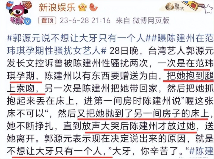 2023年,台娱圈的“Metoo”风云爆发,多名女艺东谈主实名指控陈建州性烦嚣,其中,受害者大牙(周宜霈)的描摹极其谛视,而另一位受害者以至是范玮琪我方的化妆师。